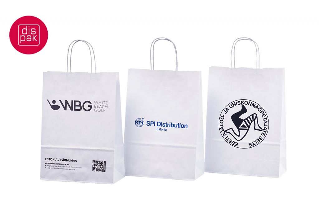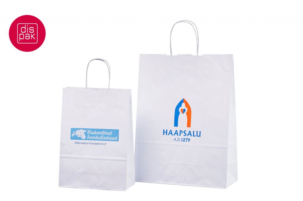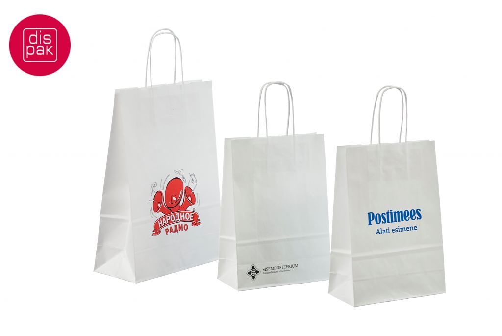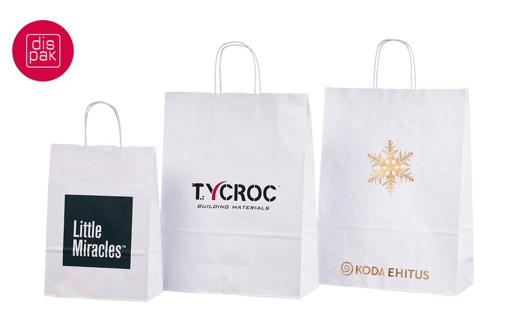 Vahvat ja kestävät valkoiset paperikassit. Kuljetus Suomeen ilman lisämaksua. Voidaan räätälöidä omalla logolla.