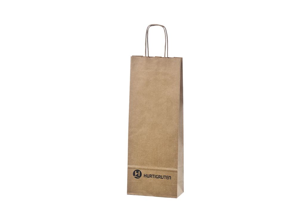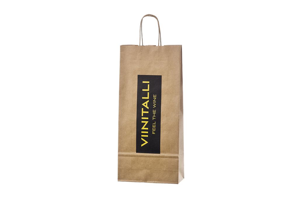 Pruun paberist veinikott mõõtudega 18x8x39,5 cm. Kotil on pr.. | Fotogalerii-Pruun paberist veinikott trükiga