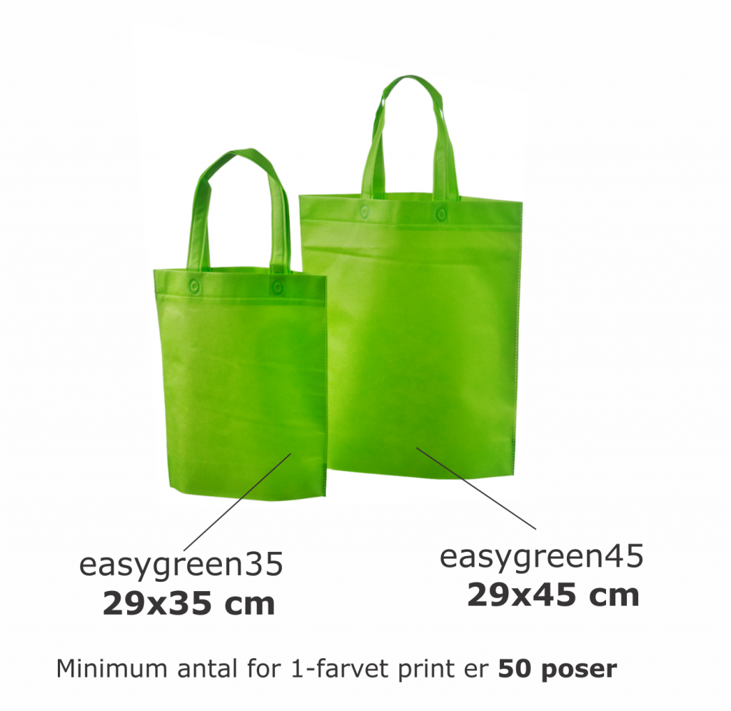 Nedenstående tabel viser priserne for de følgende grønne non-woven poser: 50, 100, 200, 300, 500 og 1.000 poser med 1-farvet print på én side af posen og inkluderer transport til Danmark.