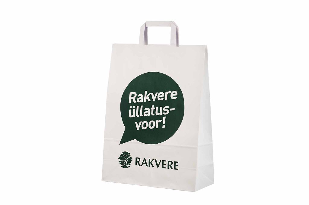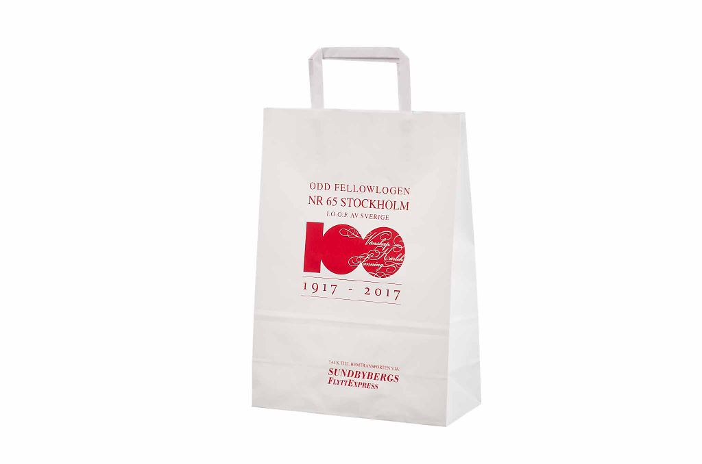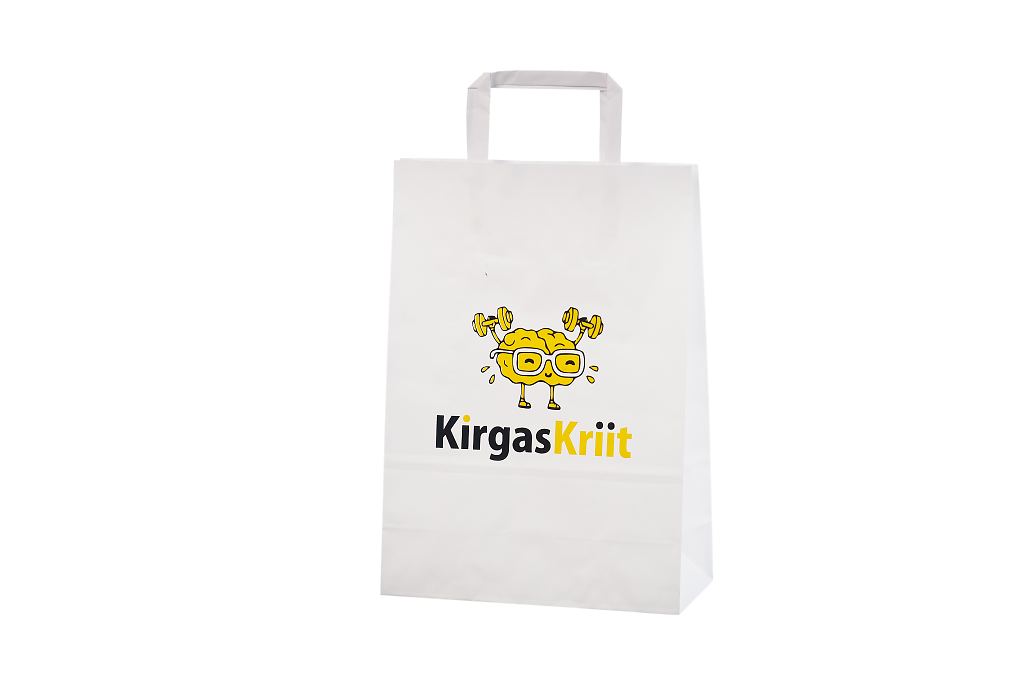 Vahva, korkealaatuinen valkoinen litteäkannikkeinen paperikassi. Saatavana yksilöllisellä painatuksella. Minimitilausmäärä omalla painatuksella on 50 kappaletta.