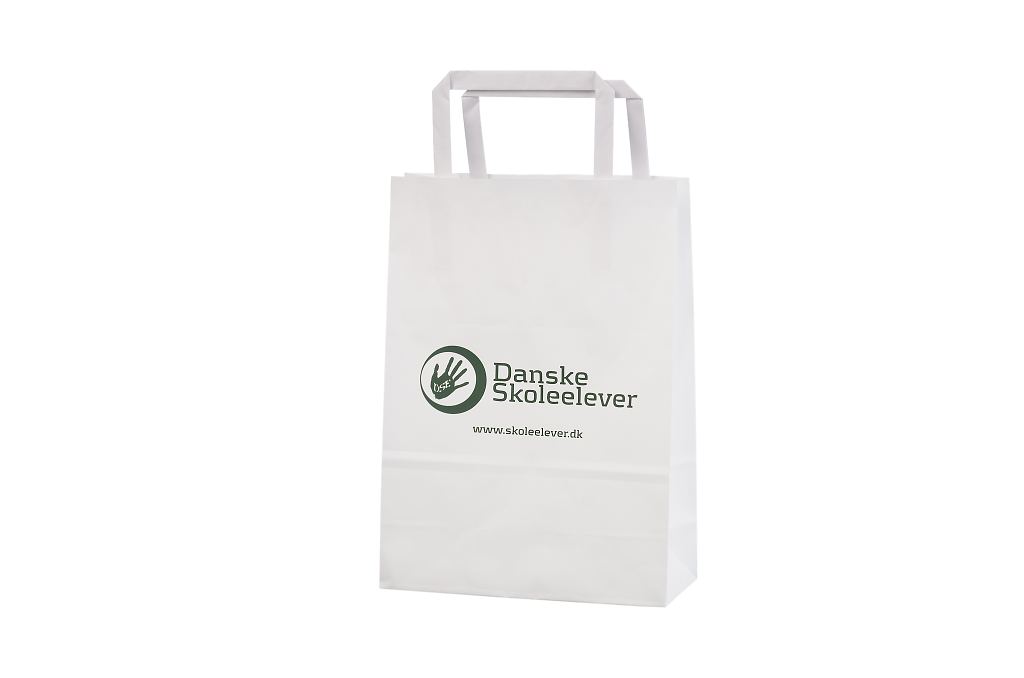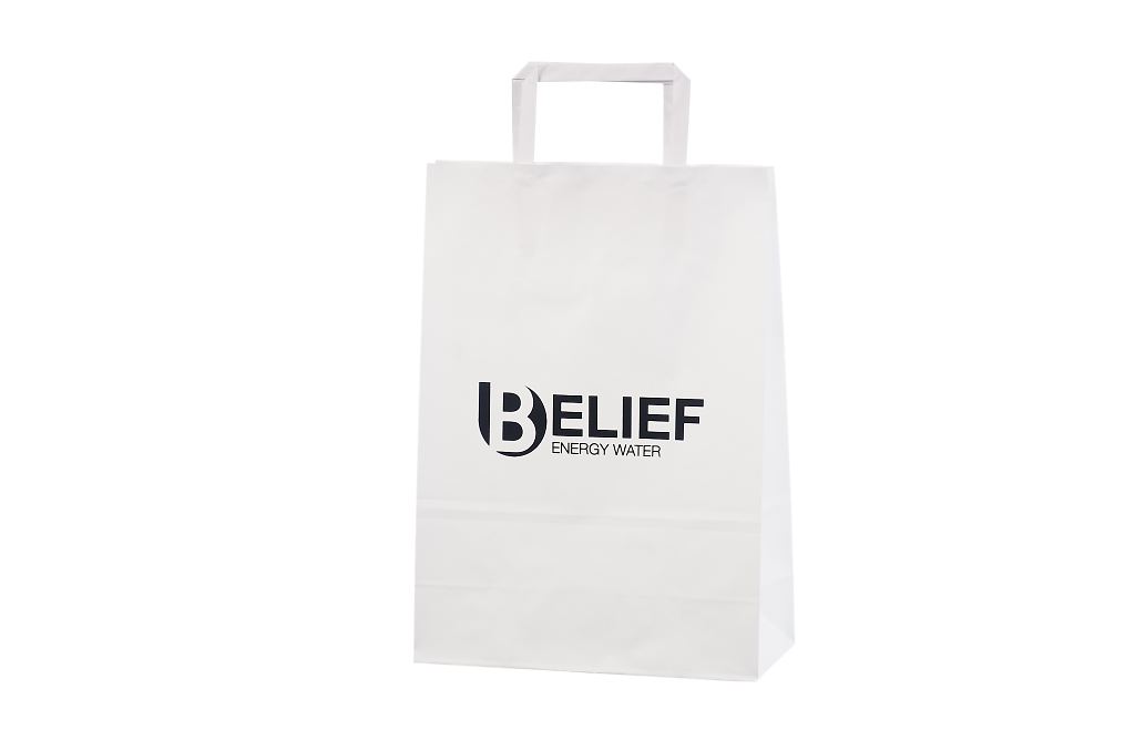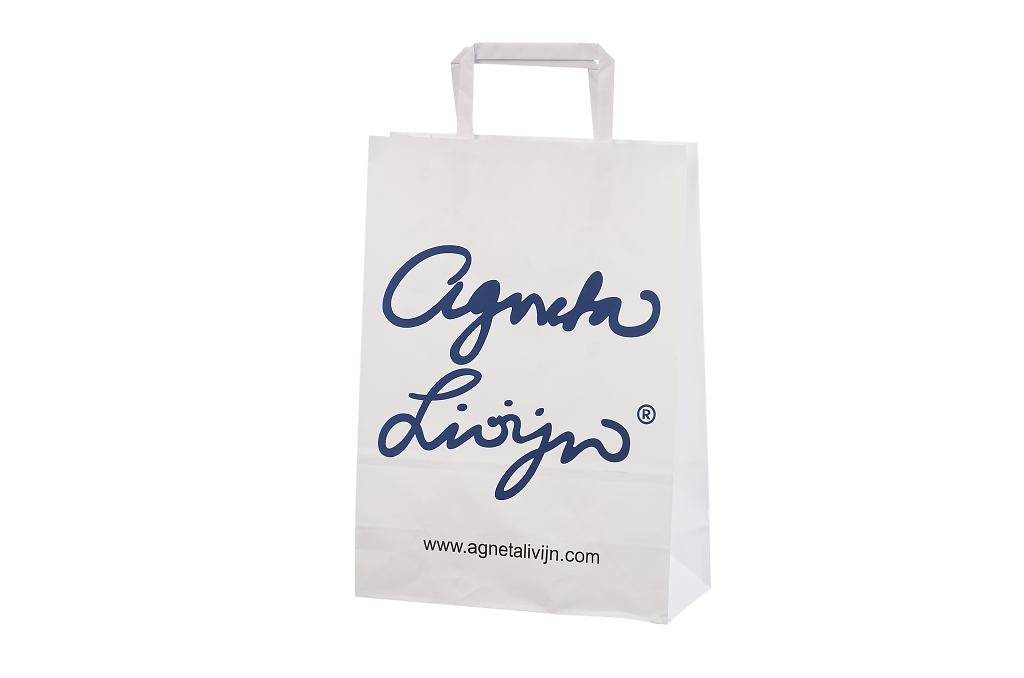Vahva, korkealaatuinen valkoinen litteäkannikkeinen paperikassi. Saatavana yksilöllisellä painatuk