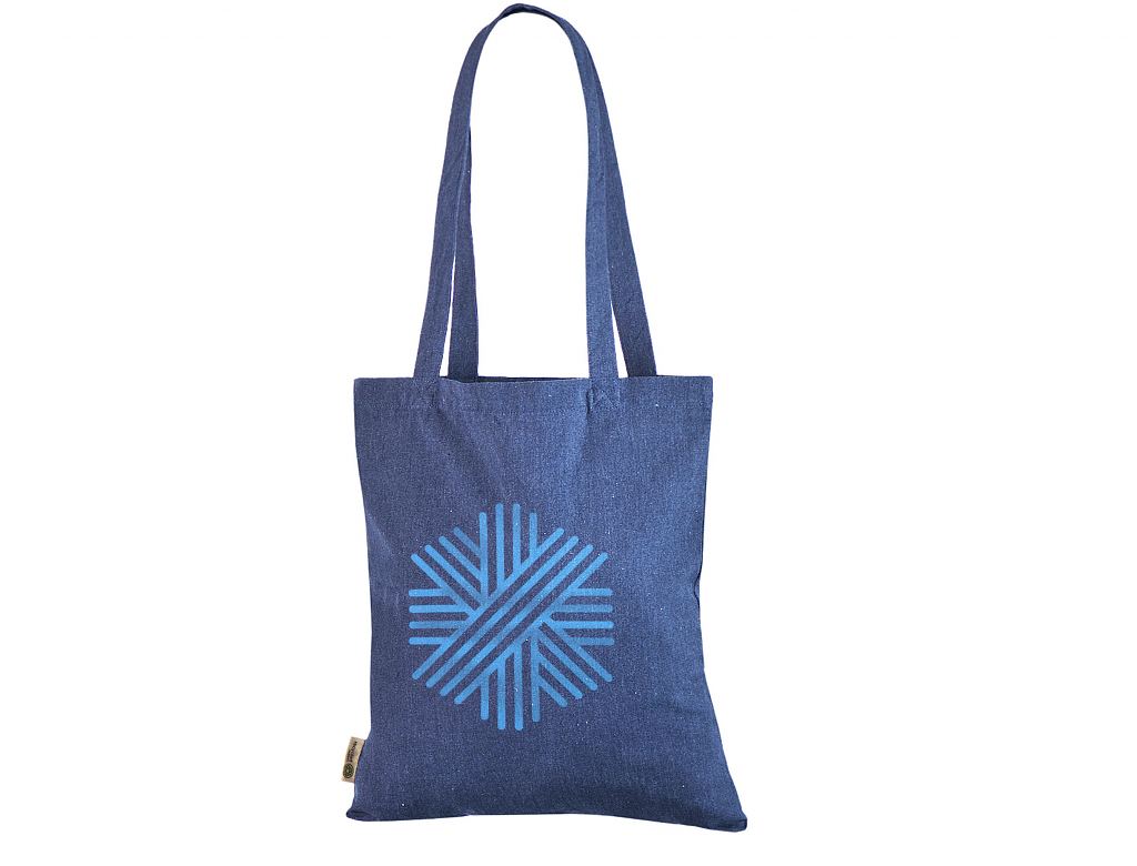 Sinised ümbertöödeldud puuvillast kotid. Kottidele on võimalik peale trükkida logo 1 kuni 6 värvi.