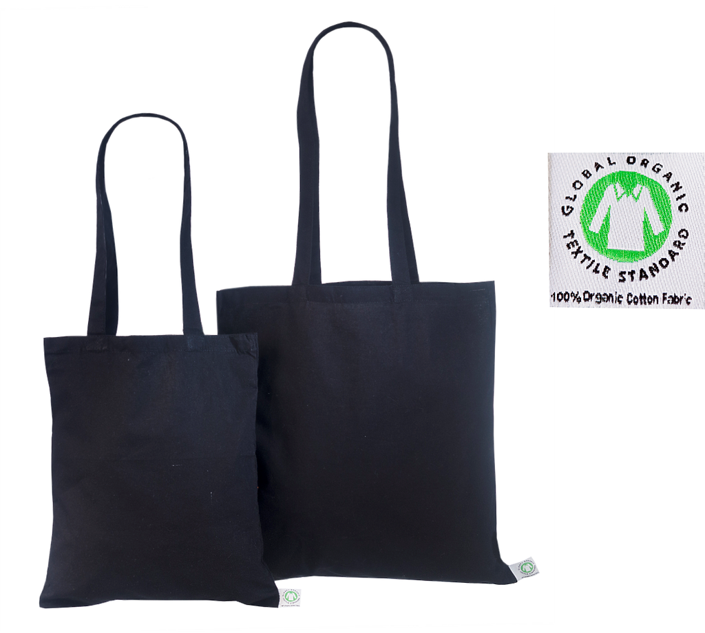Våra svarta ekologiska tygkassar, som tillverkas i 140 g/m2-bomull, finns i två storlekar: