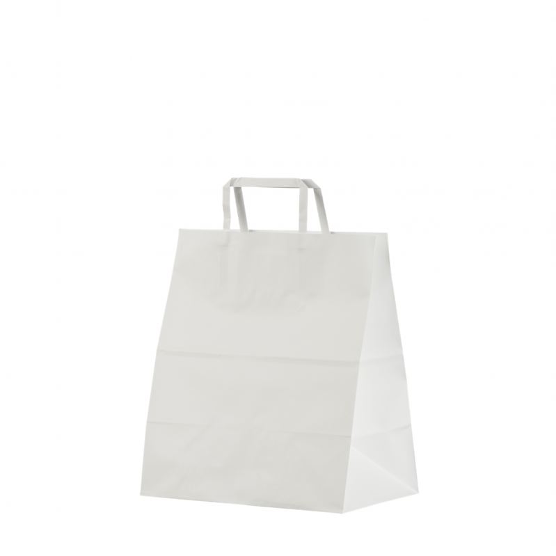 Valge take away paberkott mõõtudega 26x16x29 cm Hinnad alates  0,32 eur/tk   Valge take away kott on valmistatud tugevast 90 gr/ m2 valgest kraftpaberist   Kui soovite ilma trükita kotte, toimetame need reeglina kliendile kas juba samal päeval või hiljemalt järgmisel päeval Lamedate pabersangadega valgest kraftpaberist kott.