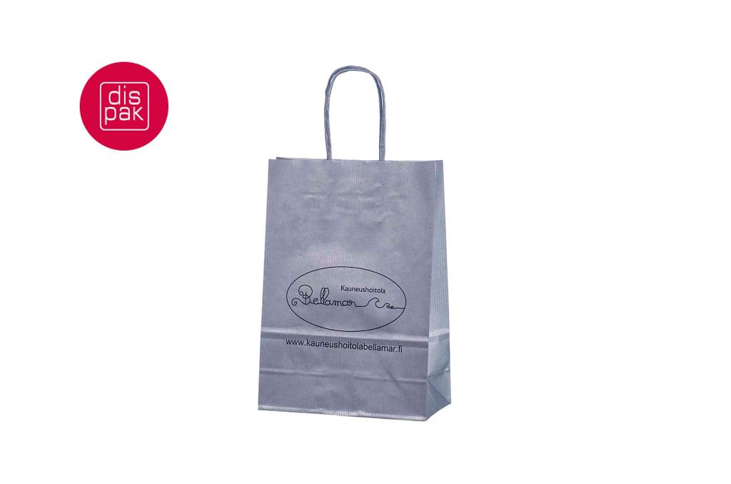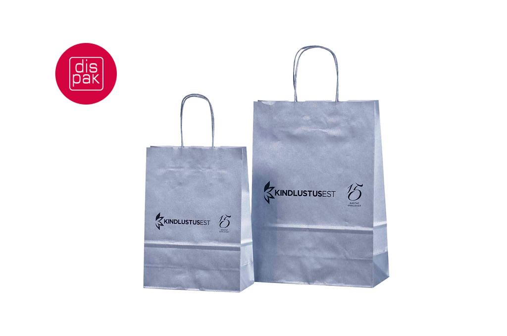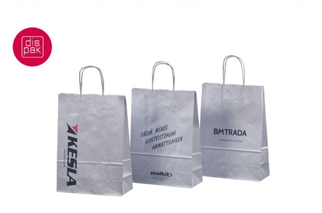 personaalse pealetrükiga hõbedane paberkott | Fotogalerii- hõbedased paberkotid, millele trükitud klientide logod.